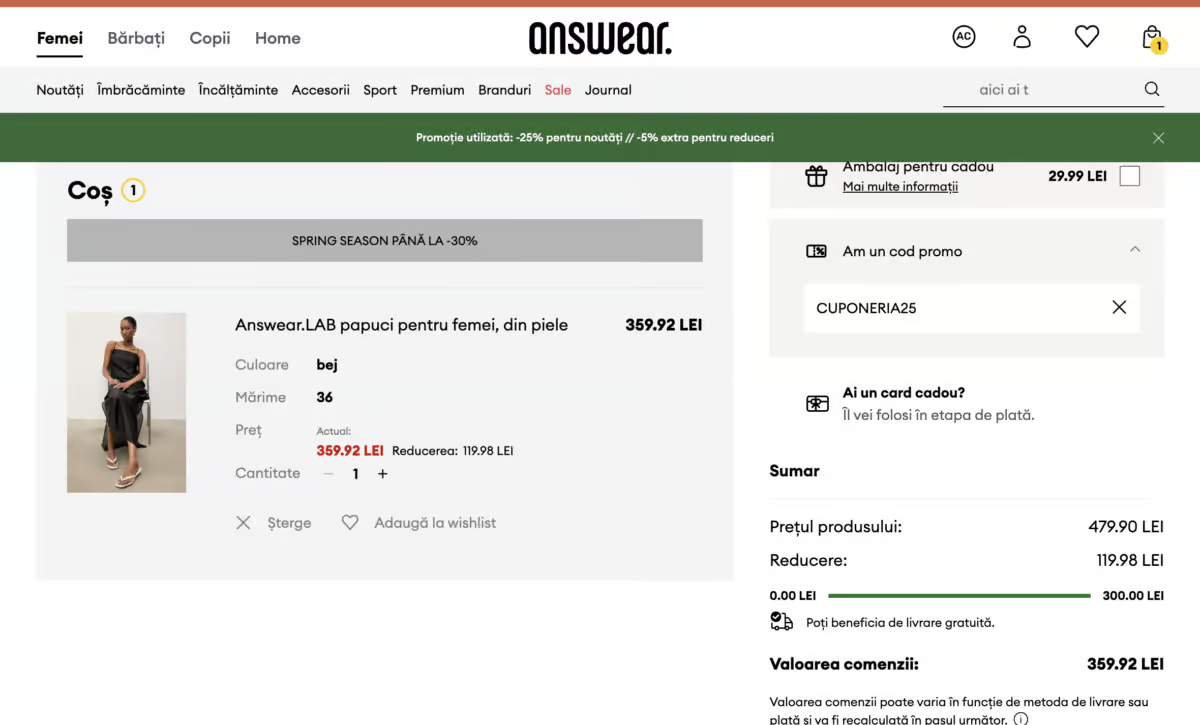 În coșul de cumpărături, sub produsele comandate, în partea dreaptă se află câmpul numit „cod promo” unde veți introduce codul.