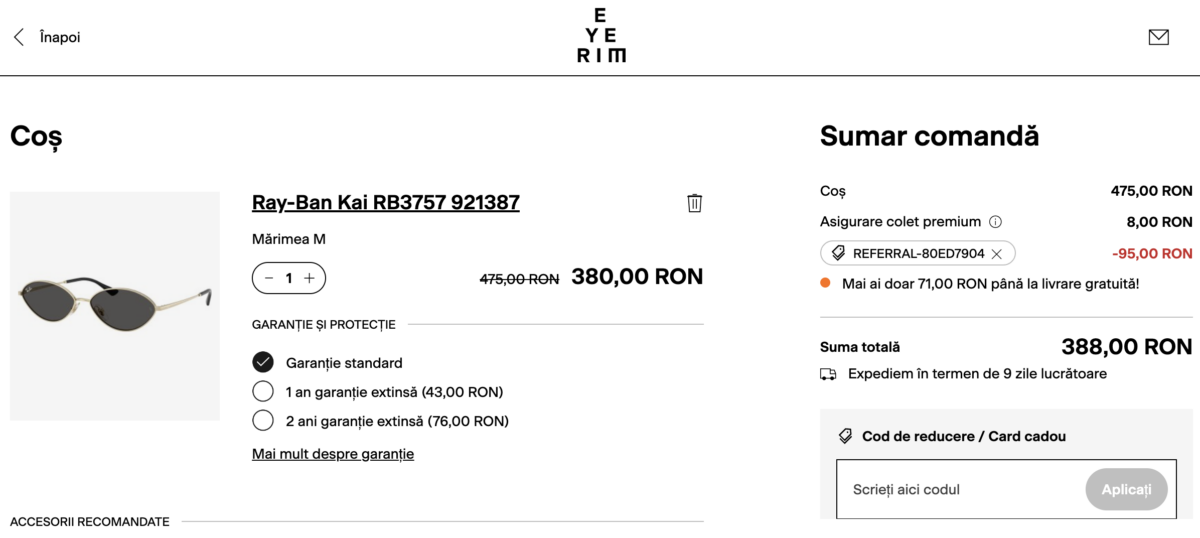 Suma pe care o poți economisi cu un cod de reducere de la Eyerim poate varia în funcție de valoarea comenzii și de valoarea discountului oferit. De regulă, procentul de reducere poate fi cuprins între 5% și 50%, iar suma economisită poate ajunge la câteva sute de lei, în funcție de situație.